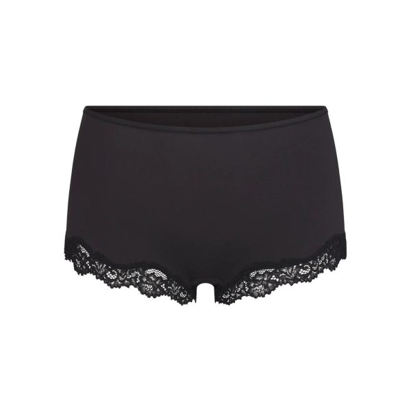 A buttery-soft, mid-rise boy short with feminine stretchy lace trim details along the leg openings. Features maximum back coverage and a 100% Cotton gusset. Fits true to size.