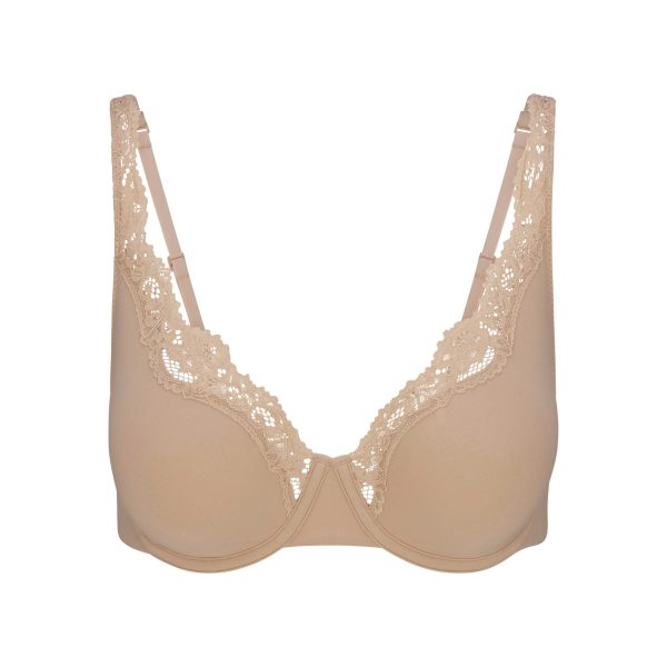 Take the Fits Everybody plunge. This lace-trimmed bra is made with our signature, second-skin fabric and features full coverage cups for support. Offers a custom fit when between sizes with 360-stretch technology. Complete with a comfortable underwire you can’t feel, adjustable elastic straps, and a hook and eye back closure. Fits true to your SKIMS bra size.